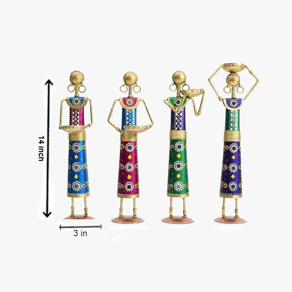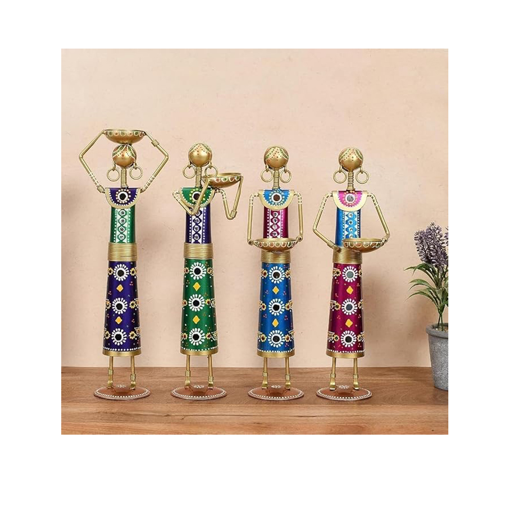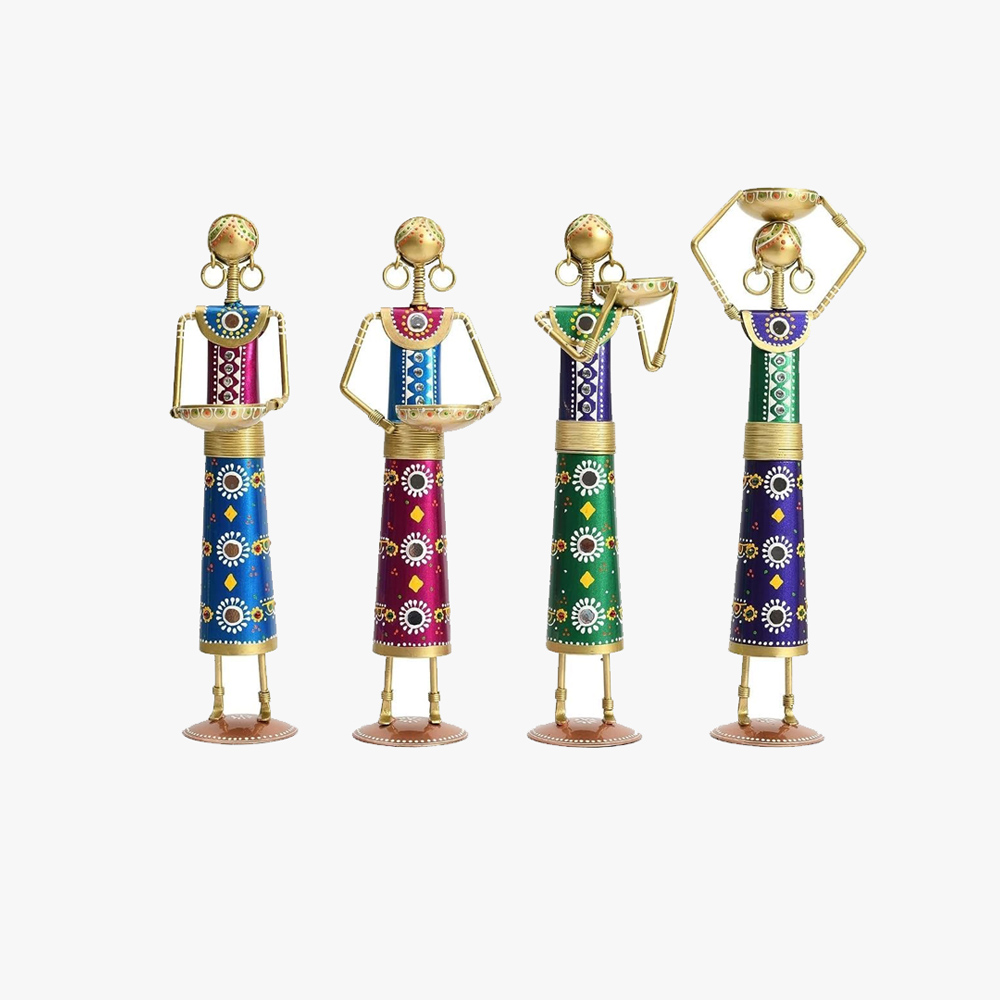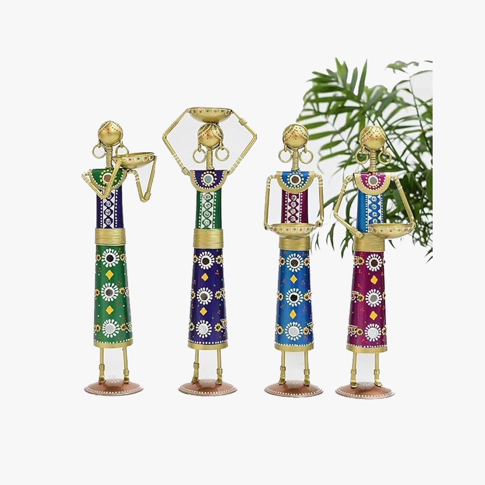 • Handcrafted Elegance: Set of four beautifully handcrafted metal tea light candle holders, showcasing intricate Rajasthani Kalbelia doll designs.